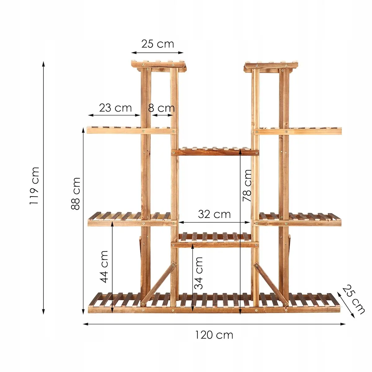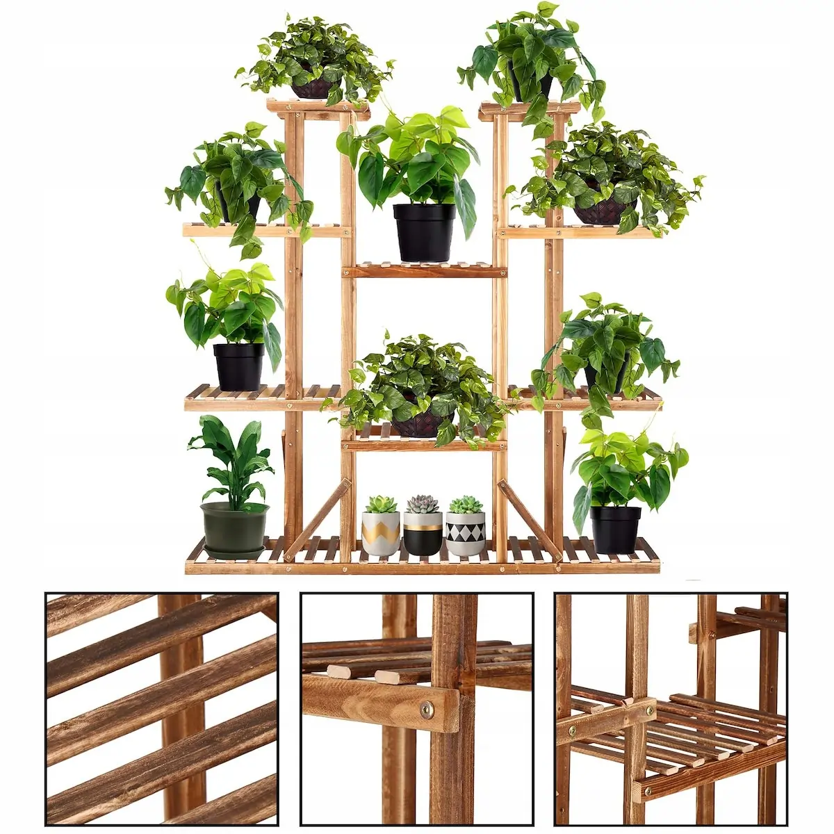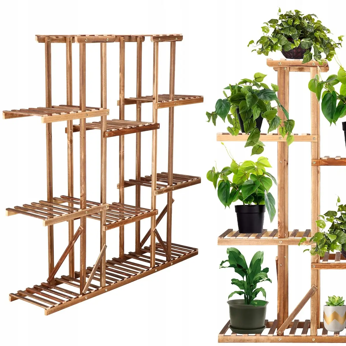 Viacposchodový stojan na kvety je mimoriadne praktickým a efektívnym riešením pre milovníkov rastlín, ktorí stále hľadajú nové nápady na vystavenie kvetov a pre tých, ktorým chýba miesto na kvetináče. Drevený stojan, do ktorého sa zmestí až 15 veľkých kvetináčov, vám umožní vyplniť predtým prázdne kúty zeleňou a maximálne využiť zastarané priestory na miestach ako: