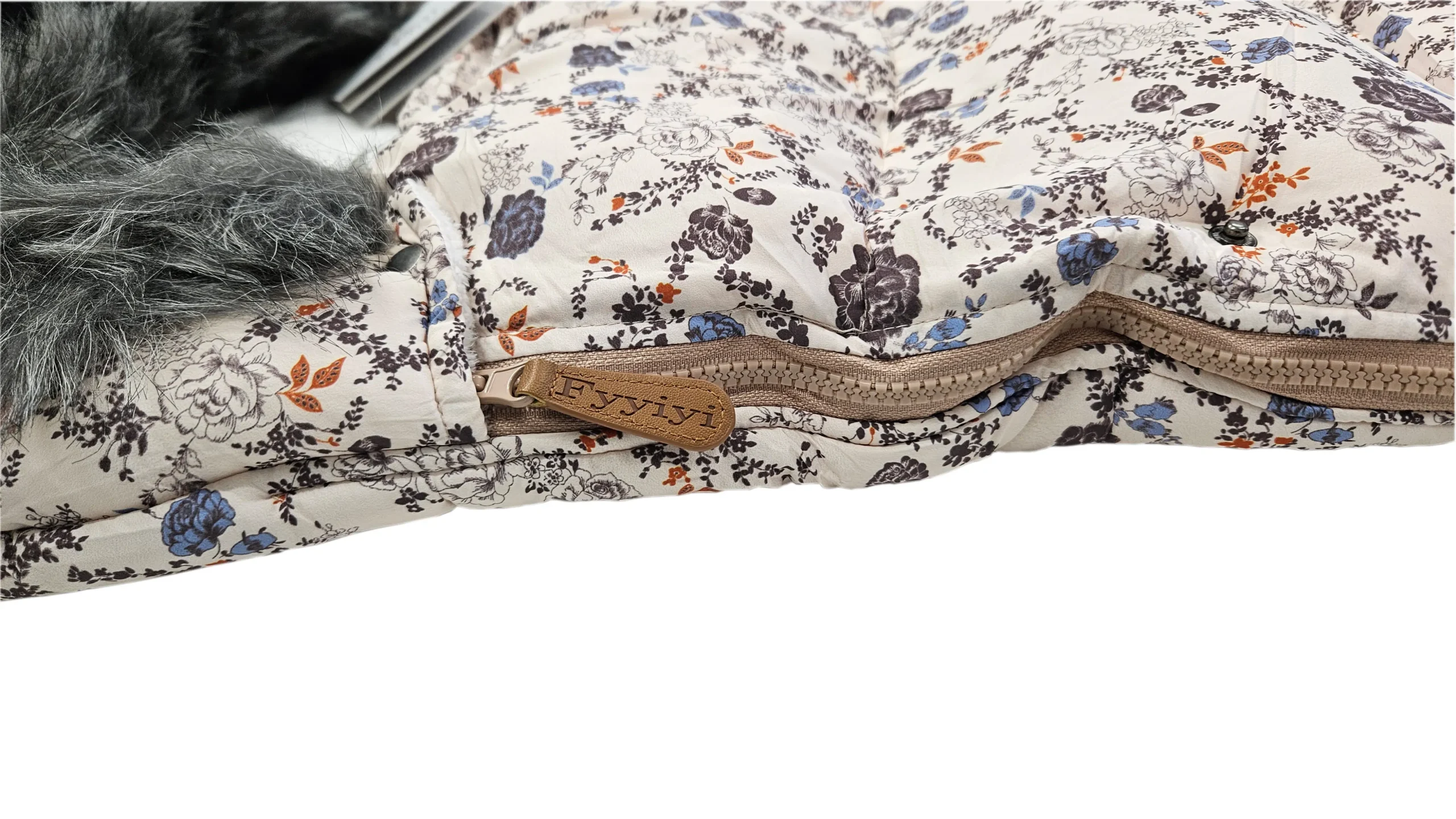 Vodeodolný, vetruodolný zimný spací vak na kočiar . Poskytuje teplo a pohodlie počas zimných prechádzok. Vyrobené z odolnej tkaniny odolnej voči nečistotám z vonkajšej strany a jemného mikroflísu vo vnútri . Podšité ekokožušinou.