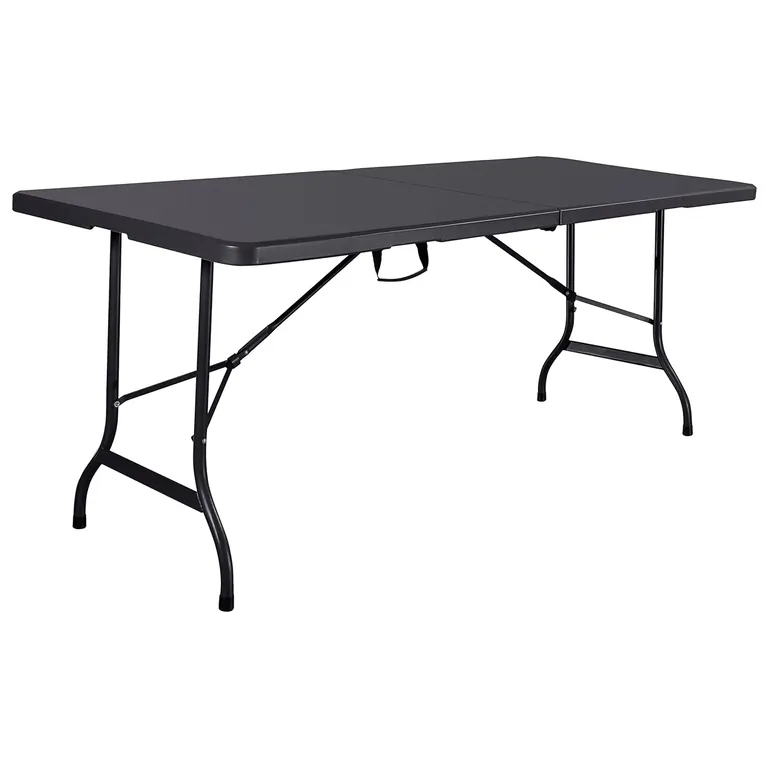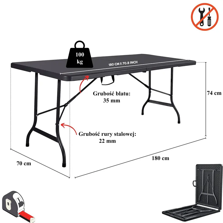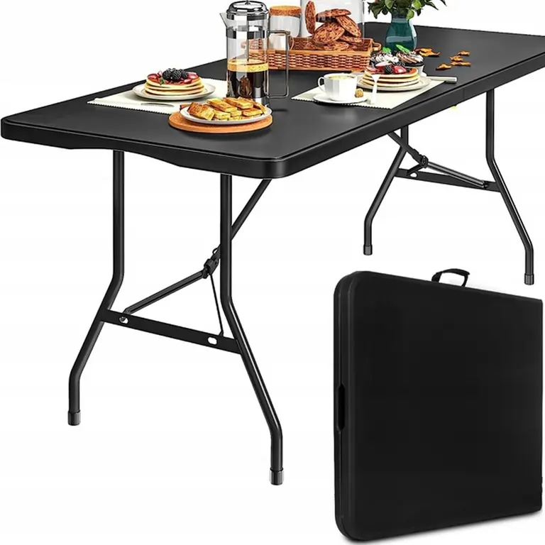Čierny rozkladací stôl 180 x 70 x 74 cm je veľký a stabilný. Jeho vrchná časť je vyrobená z tvrdého plastu , čo uľahčuje údržbu. Nohy zložené pod doskou stola sú vyrobené z ocele a sú chránené proti prehnutiu pod váhou jedla a nápojov . Keď ho nepoužívate alebo ho chcete prepravovať, zmení sa na stolový kufor. V tomto šikovnom dizajne sú nohy modelu skryté vo vnútri. Rukoväť vám pomôže pohodlne nosiť.