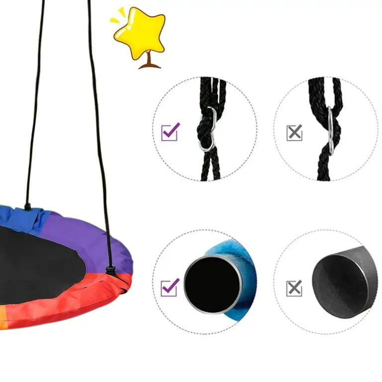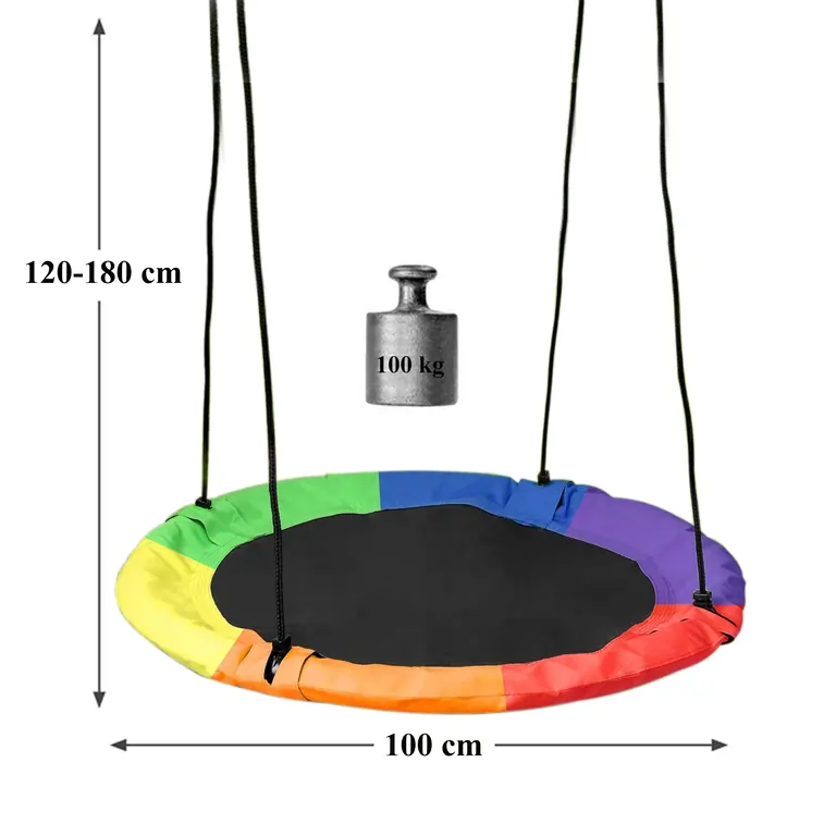 Priemer sedátka je  až 100 cm , čo zaisťuje pohodlie pri používaní a môže sa na ňom hrať aj niekoľko detí. Sedák je vyrobený z pletených PE lán, ktoré poskytujú dobrú priľnavosť. Hojdačka je vyrobená z  kvalitného materiálu , vďaka čomu je konštrukcia  odolná voči poveternostným vplyvom.