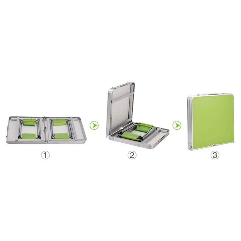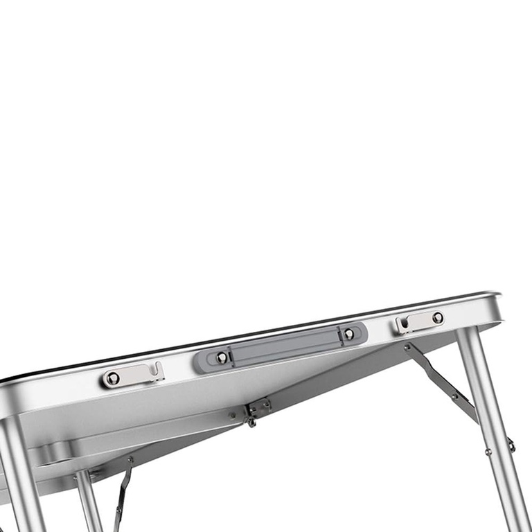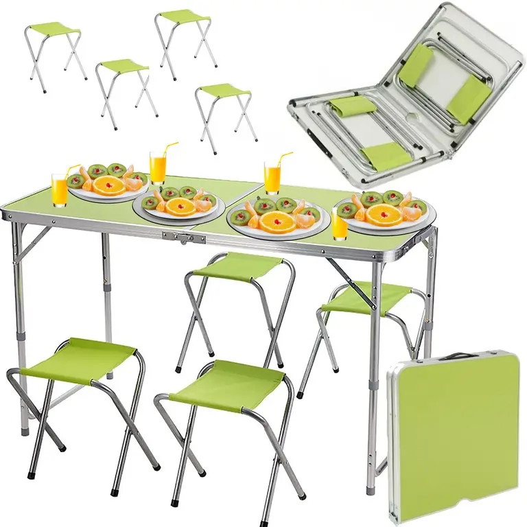 Skladací kempingový stôl má hliníkový rám, ktorý zaisťuje ľahkosť a odolnosť . Rám má stolovú dosku vyrobenú z odolného a ľahko čistiteľného plastu . Turistický set stola a stoličiek sa veľmi jednoducho používa . Dá sa rýchlo zložiť a rozložiť , vďaka čomu je veľmi praktický pri cestovaní. V zloženom stave zaberá málo miesta , čo uľahčuje skladovanie a prepravu. Stôl má nastaviteľnú výšku nôh , čo znamená, že ho možno prispôsobiť individuálnym potrebám.
