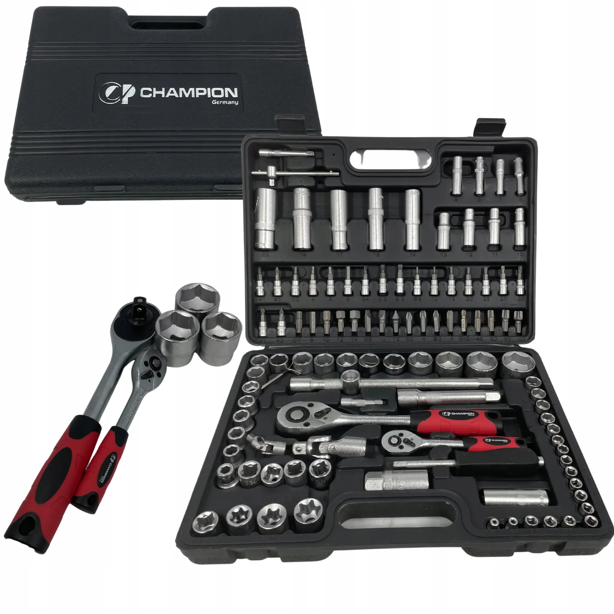 1/2″ zásuvky: 10,11,12,13,14,15,16,17,18,19,20,21,22,23,24,27,30,32mm. 1/2″ dlhé zásuvky: 14,15,17,19mm. 1/2″ objímky na sviečky: 16,21 mm 1/4″ zásuvky: 4,4,5,5,5,5,6,7,8,9,10,11,12,13,14mm. 1/4″ dlhé zásuvky: 6,7,8,9,10,11,12,13mm. 1/4″ zásuvky s bitmi Torx (T8,10,15,20,25,30) imbusový kľúč (3,4,5,6mm) PZ (1,2), PH (1,2) Plochý (4,5,5,7 mm) Bity imbusový kľúč (6,8,10,12,14mm) PH (3,4) Ploché (8, 10, 12 mm) HP (3.4) Torx (T40, 45, 50, 55). 1/2″ skrutkovač pre nástrčky a bity. Adaptér pre 1/2″ bity . 1/2″ a 1/4″ račne. predĺženie 1/2″ (125, 250 mm) a 1/4″ (50, 100 mm) 1/2″ priechodka Rukoväť typu T s unášacím štvorhranom 1/4″. Kardanové kĺby 1/2″ a 1/4″ . Šesťhranné kľúče typu L (1,5,2,3mm). Vnútorné zásuvky TORX (E4, E5, E6, E7, E8, E10, E11, E12, E14, E16, E18, E20, E24)