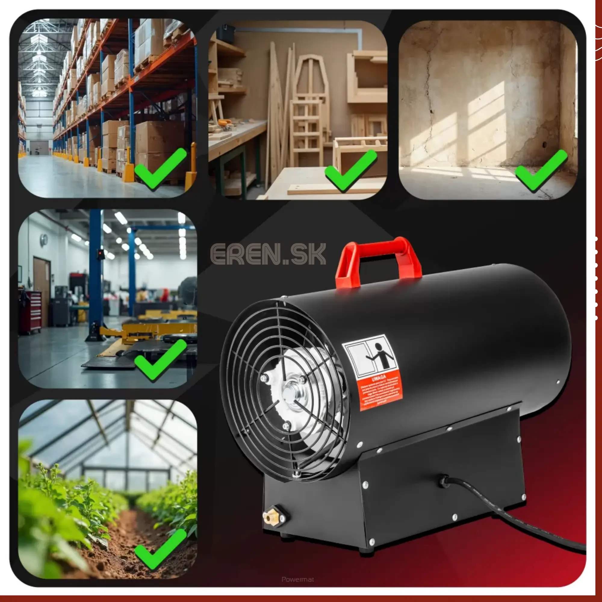 Ohrievač má 5-lopatkový ventilátor s prietokom 850 m³/h, ktorý umožňuje rýchlu distribúciu tepla vo veľkých priestoroch. Ohrievač je ideálny na vykurovanie budov, výrobných hál značnej výšky, hospodárskych budov, priechodov, skladov, dielní, kostolov, skleníkov a tunelov.
